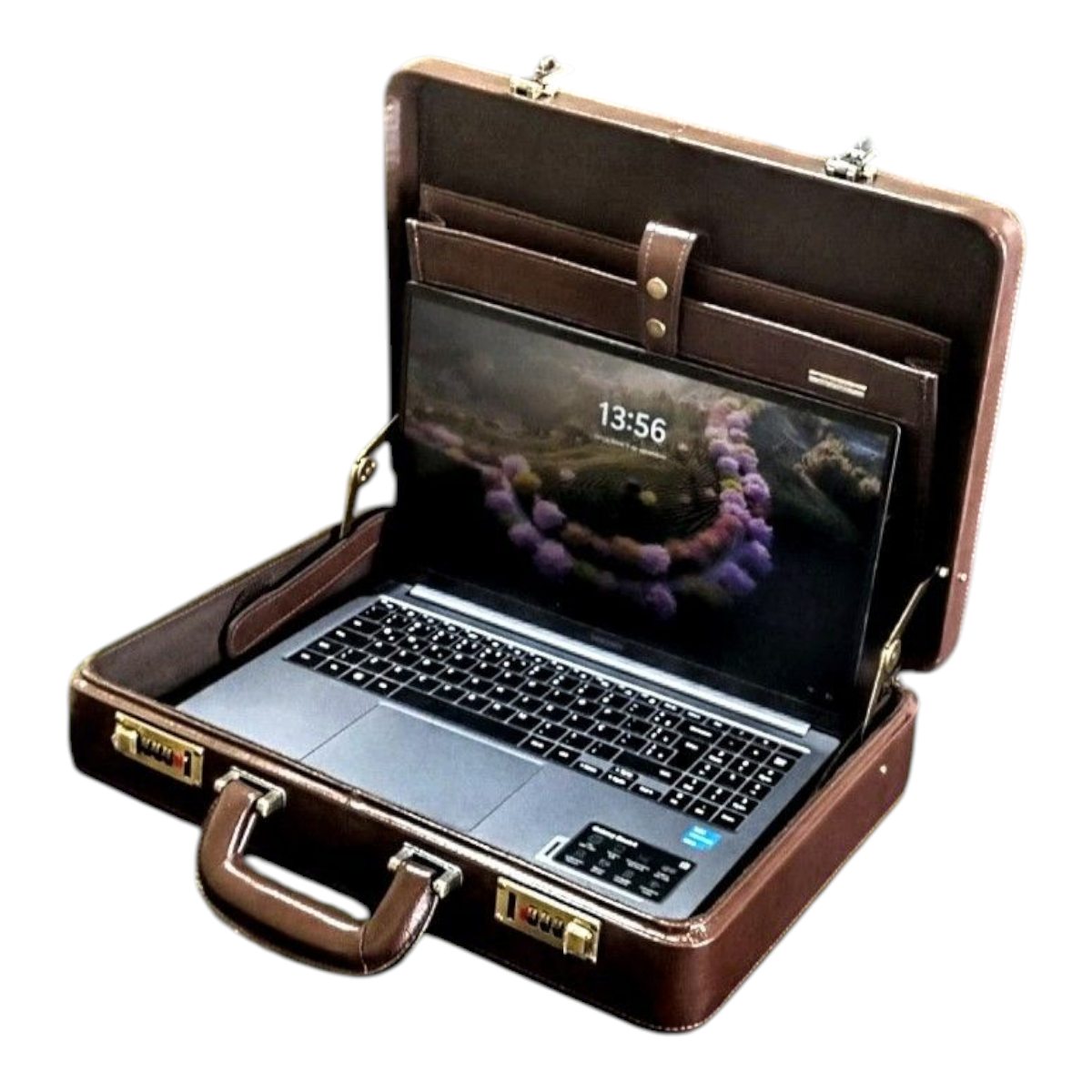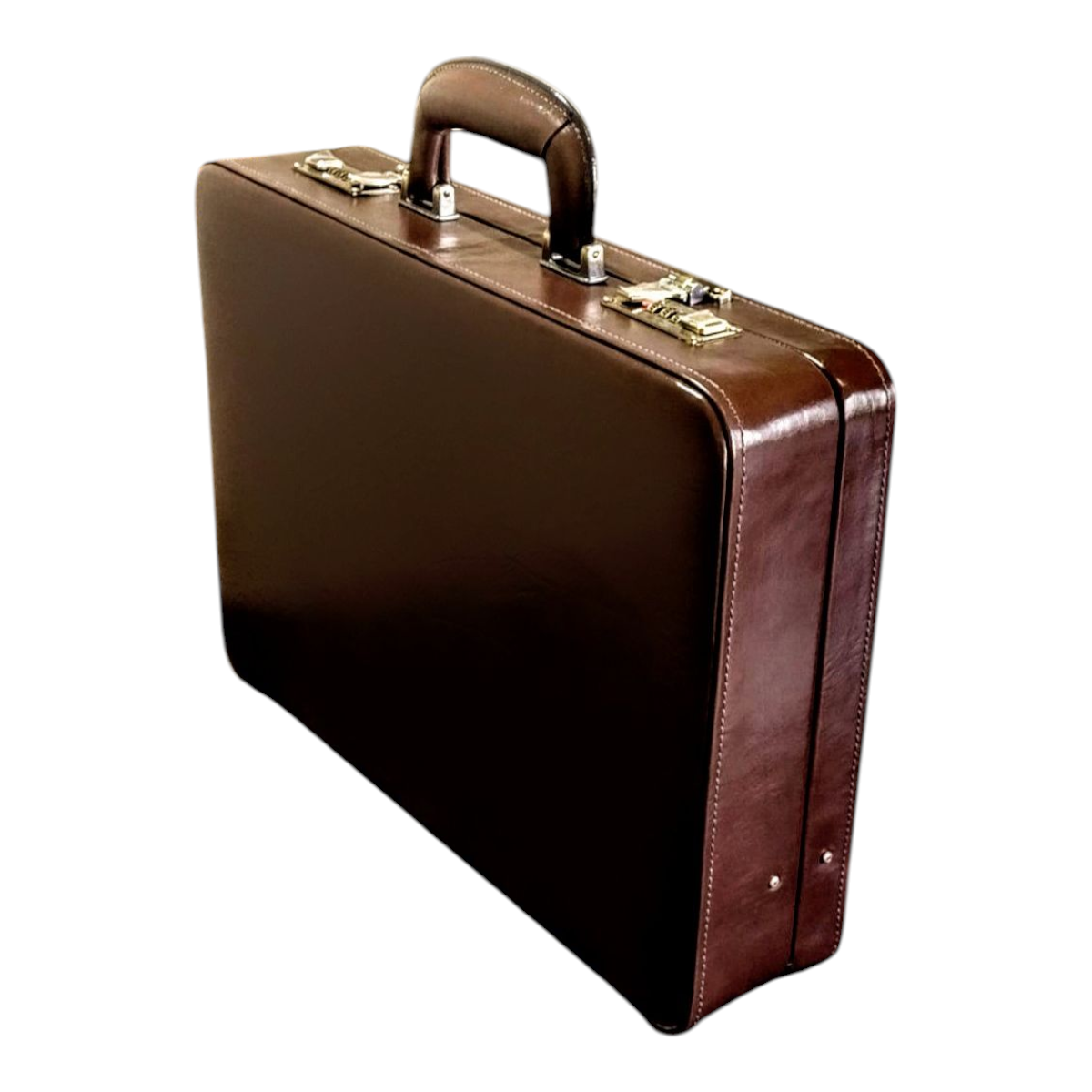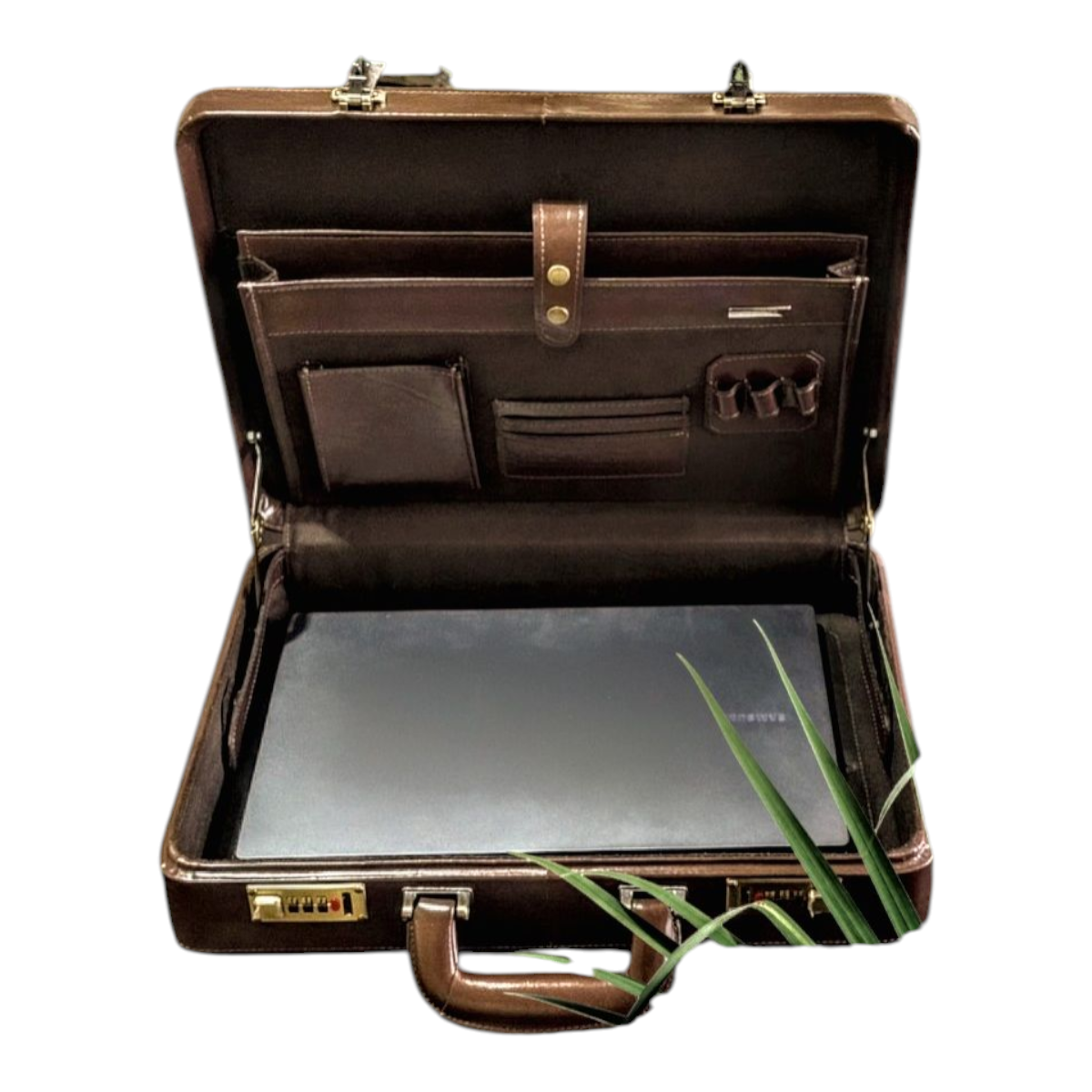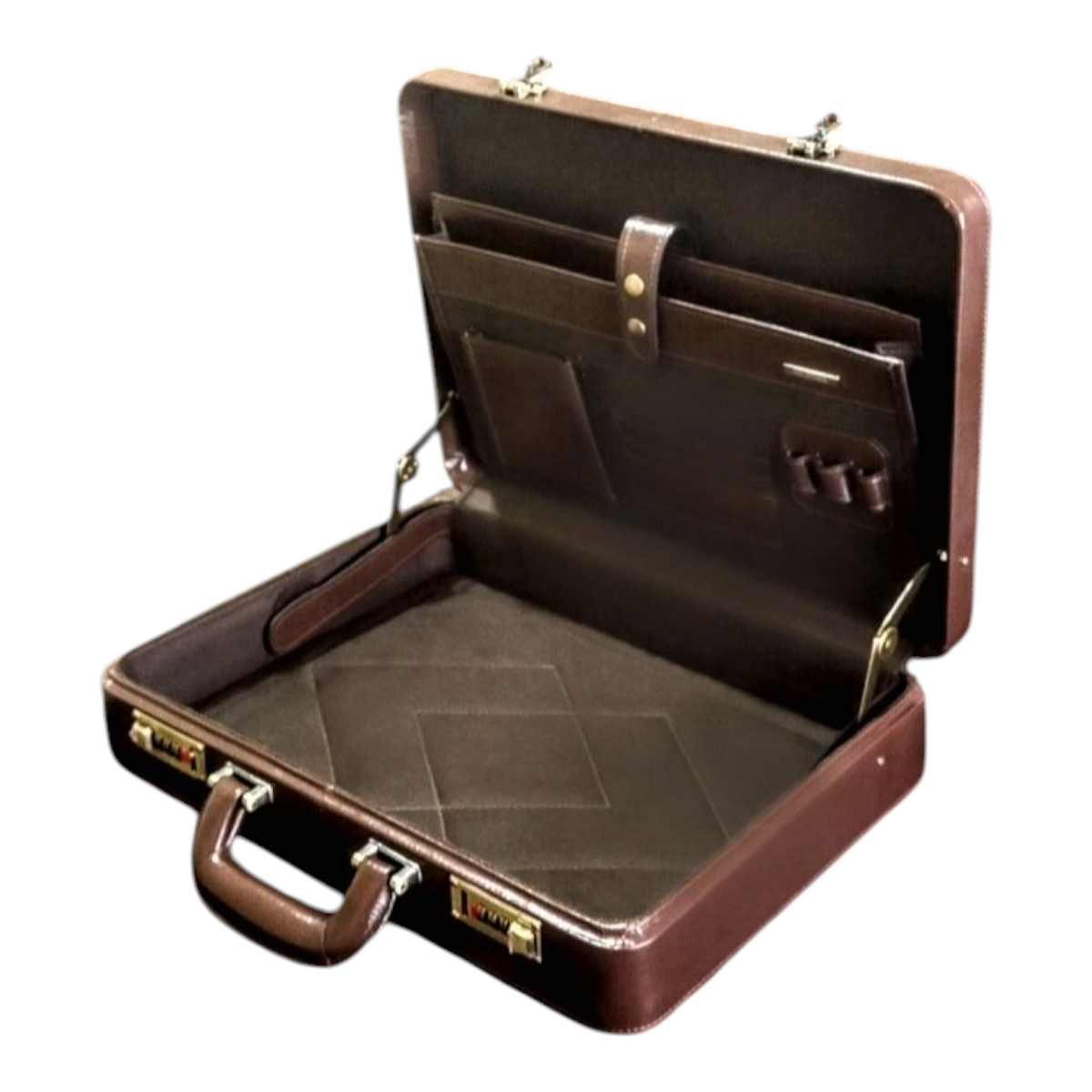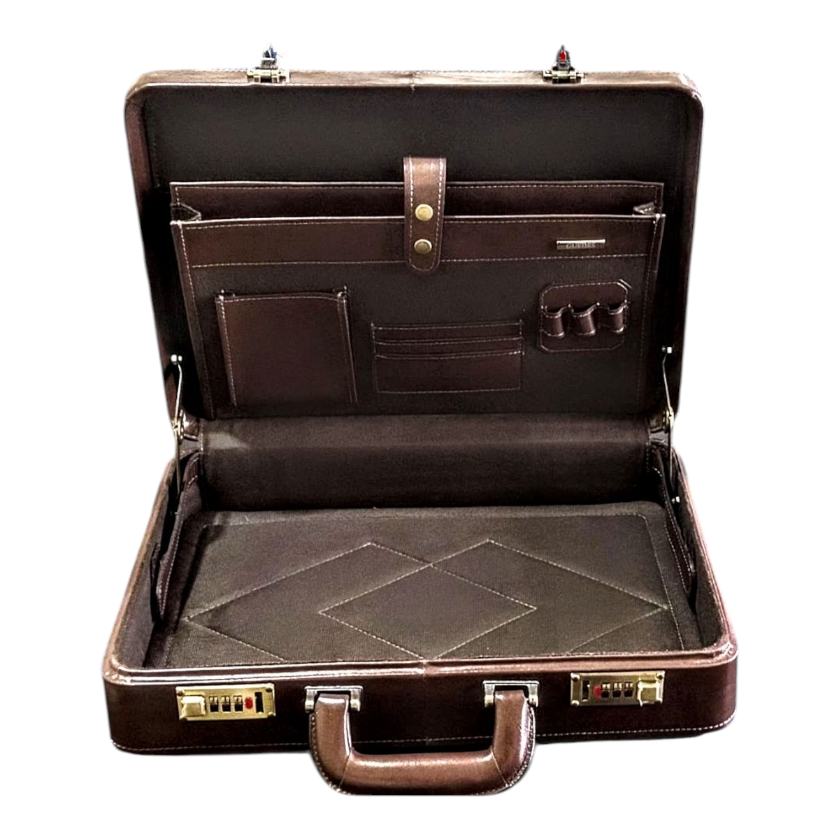 Maleta executiva em couro bovino estampa clasico café, forro veludo marrom, ferragens acabamento ouro velho, fechadura de segredo importada, espaço para notebook ate 15,6″, repartição para documentos, cartões, canetas, etc,,, 43x32x7,5 cm 2,17 kg